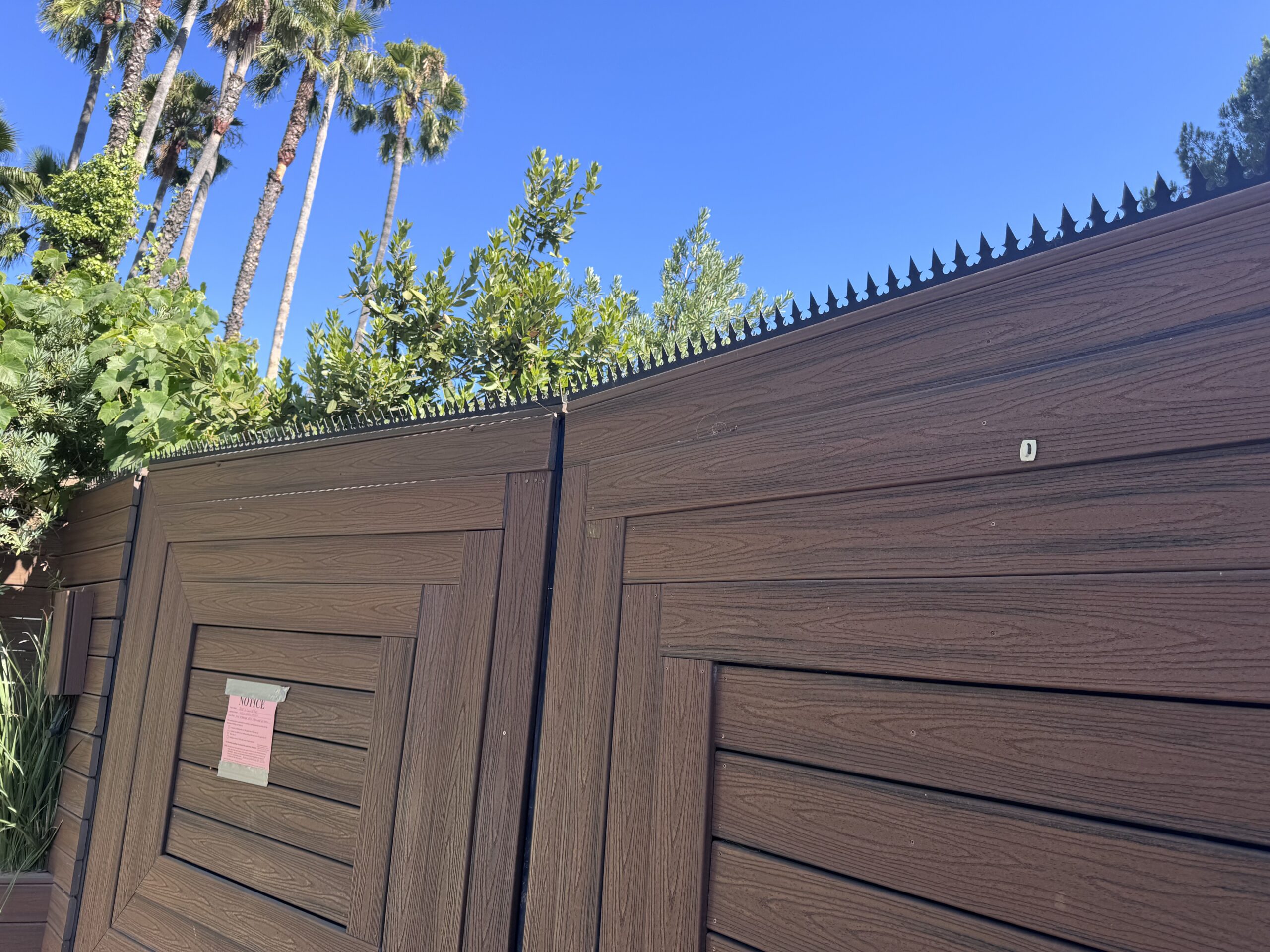 Die Installation nutzt Ninja Deterrent™ Gothic Black Dual-bladed – ein gut sichtbares Modell mit präzise geschnittenen, dreieckigen Klingen – und ist durchgehend entlang der oberen Kante des Holztors sowie der angrenzenden Zaunelemente montiert. Die dunkle Oberfläche erzeugt eine markante und zugleich elegante Silhouette vor der braunen Verbundoberfläche in Holzoptik und dem blauen Himmel Kaliforniens.