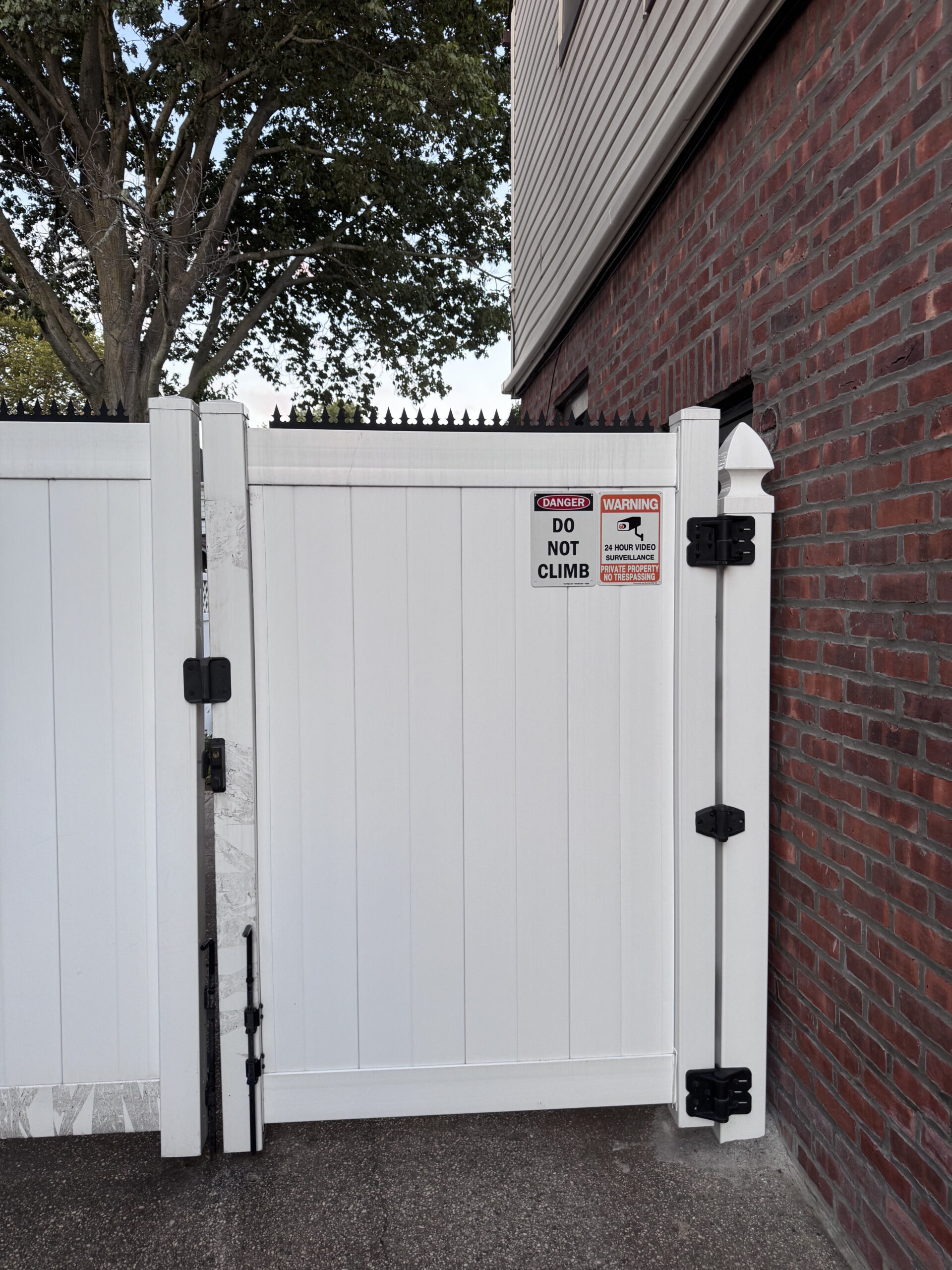 White vinyl privacy fence topped with anti-climb spikes, with “Do Not Climb” and surveillance warning signs.