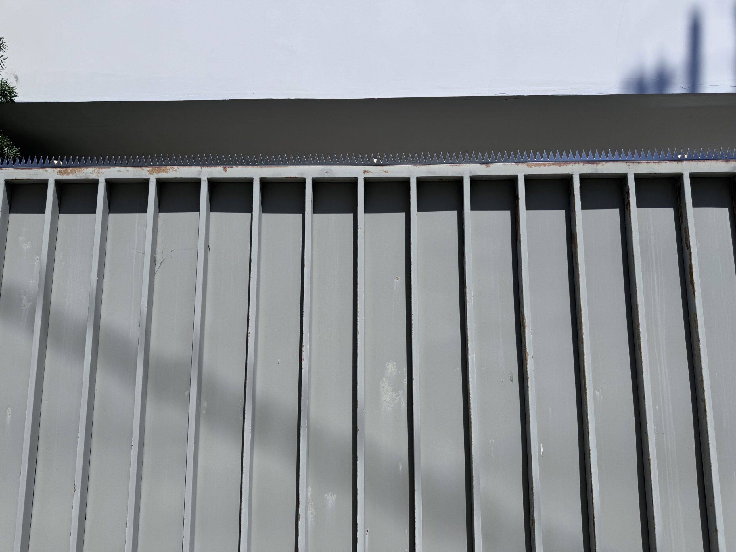 In einem ruhigen Wohngebiet von Venice haben wir die obere Kante eines robusten schmiedeeisernen Zauns zur rückseitigen Gasse hin verstärkt – mit Modern in einer durchgehenden Linie. Der Kunde mochte besonders, wie linear, kompromisslos und eindeutig modern das Profil wirkt – perfekt passend zur klaren Geometrie des Zauns.