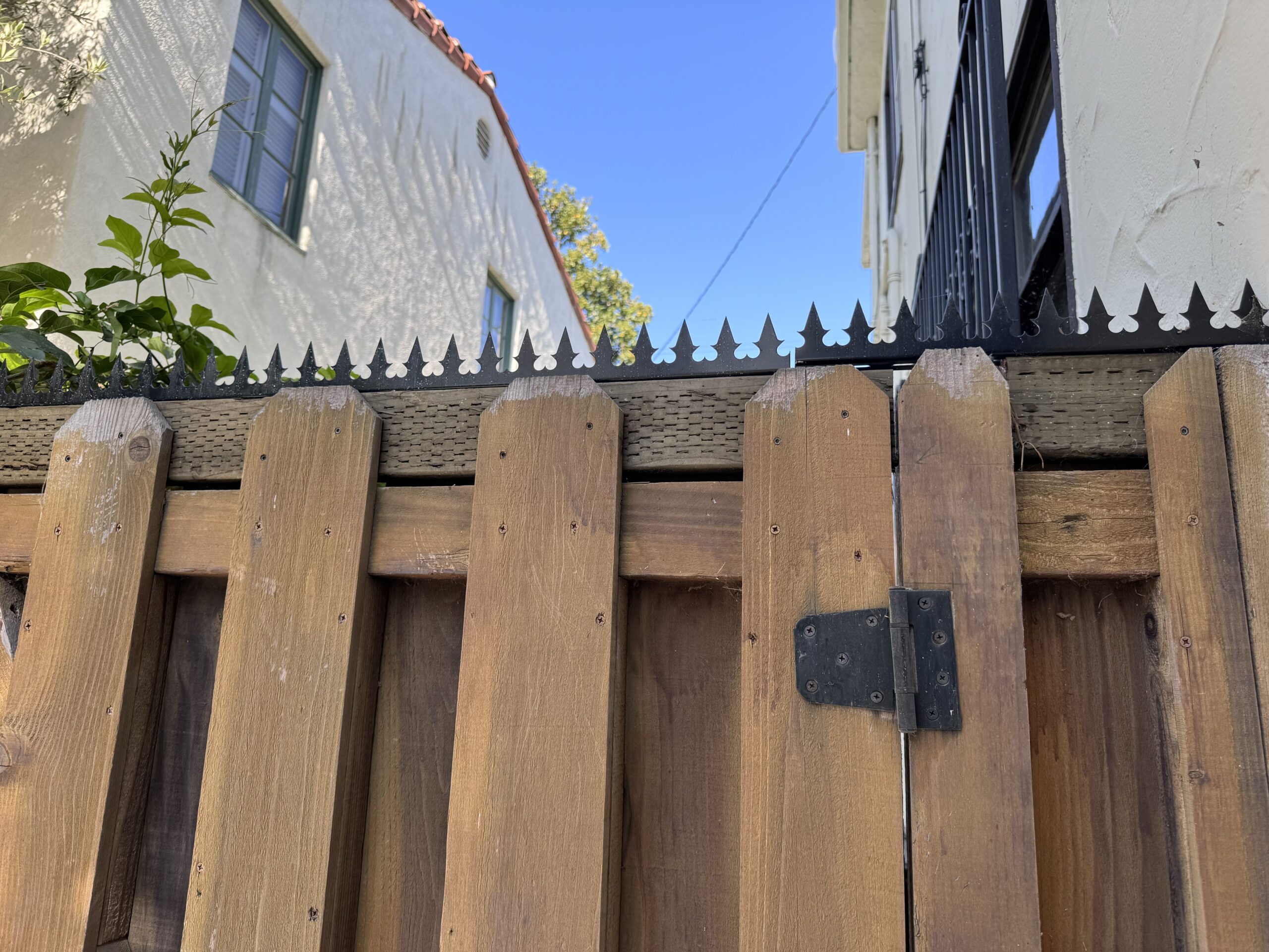 In einer ruhigen Wohngegend von Mid-City Los Angeles wünschte der Hausbesitzer eine designorientierte Lösung zur Sicherung des seitlichen Grundstücksbereichs. Die Vorgabe: eine Maßnahme, die sich in die elegante Stuck-Farbwelt und die schwarzen Schmiedeeisen-Akzente des Hauses einfügt, gleichzeitig aber gelegentliches Überklettern und Manipulationen am Seitentor zuverlässig verhindert.