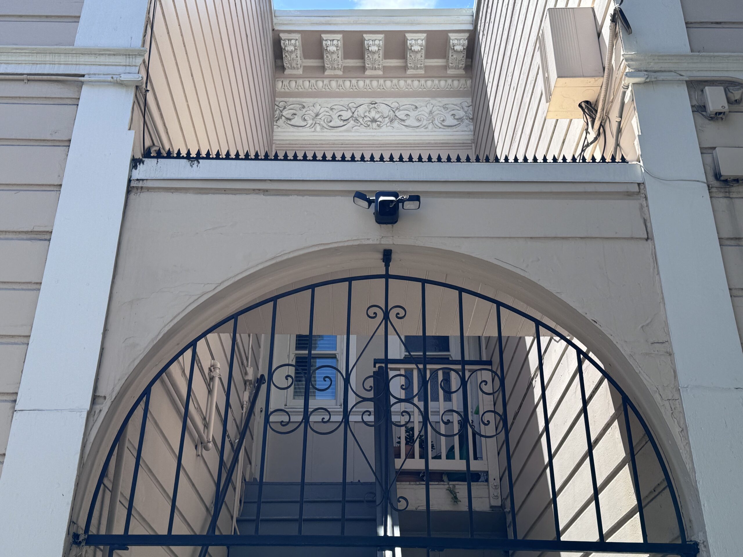 Situé dans une rue résidentielle peu passante, cet immeuble présente des moulures classiques, un portail en arc et un bardage patiné par le temps. Le client souhaitait renforcer la sécurité de l’entrée sans perturber le caractère historique. Nous avons donc spécifié un portail en fer forgé pour une douceur ornementale, et installé une ligne continue de pointes Ninja Deterrent™ au-dessus de l’arche — profil bas, mais extrêmement efficace pour dissuader l’accès aux balcons et aux zones intermédiaires.