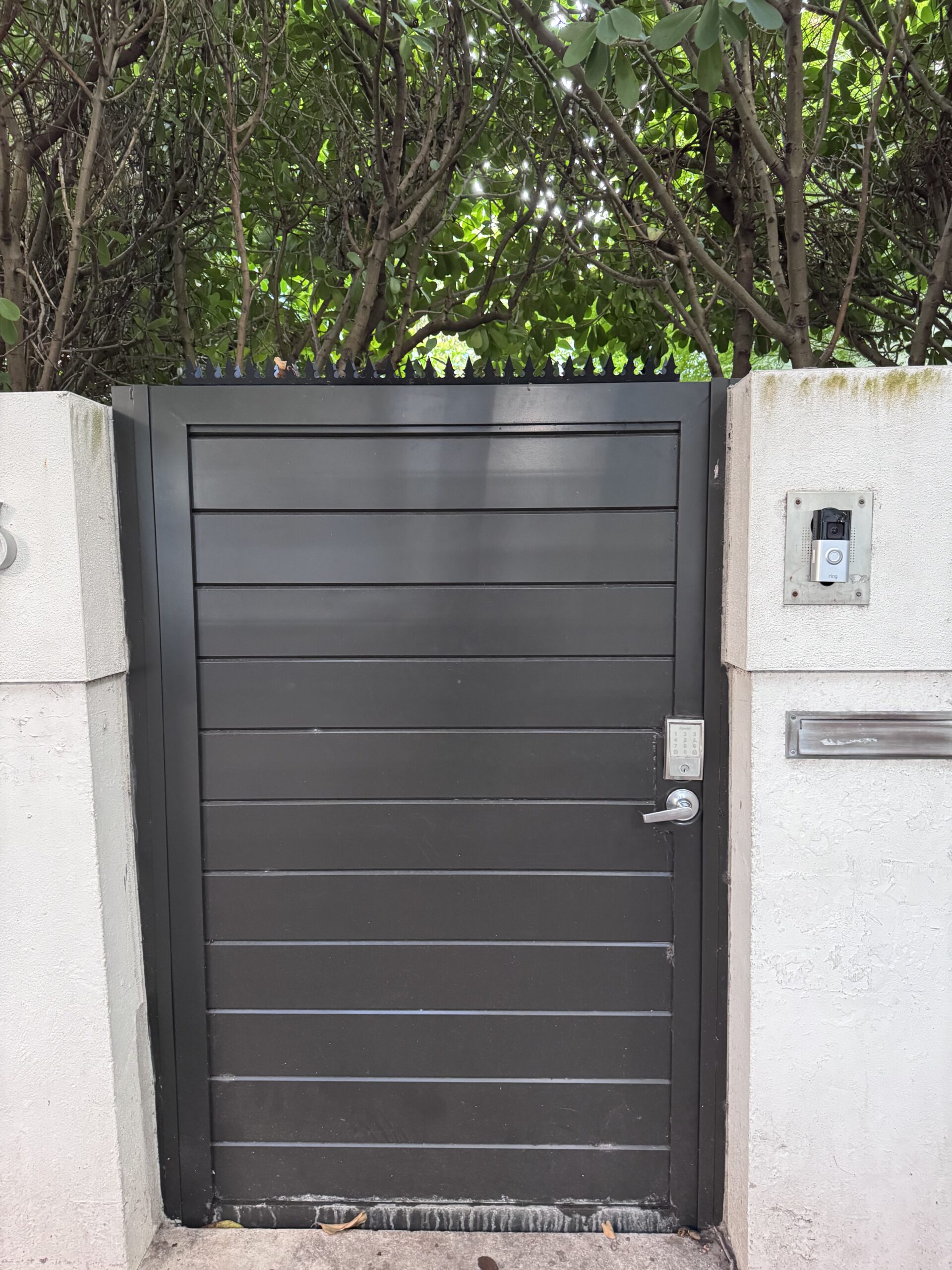 Black metal privacy gate with anti-climb finials along the top, set between concrete walls and shaded by dense greenery.