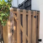 Détail des pointes de sécurité Ninja Deterrent Gothic en acier inoxydable noir sur un portail en bois robuste, alliant sécurité discrète et esthétique naturelle.