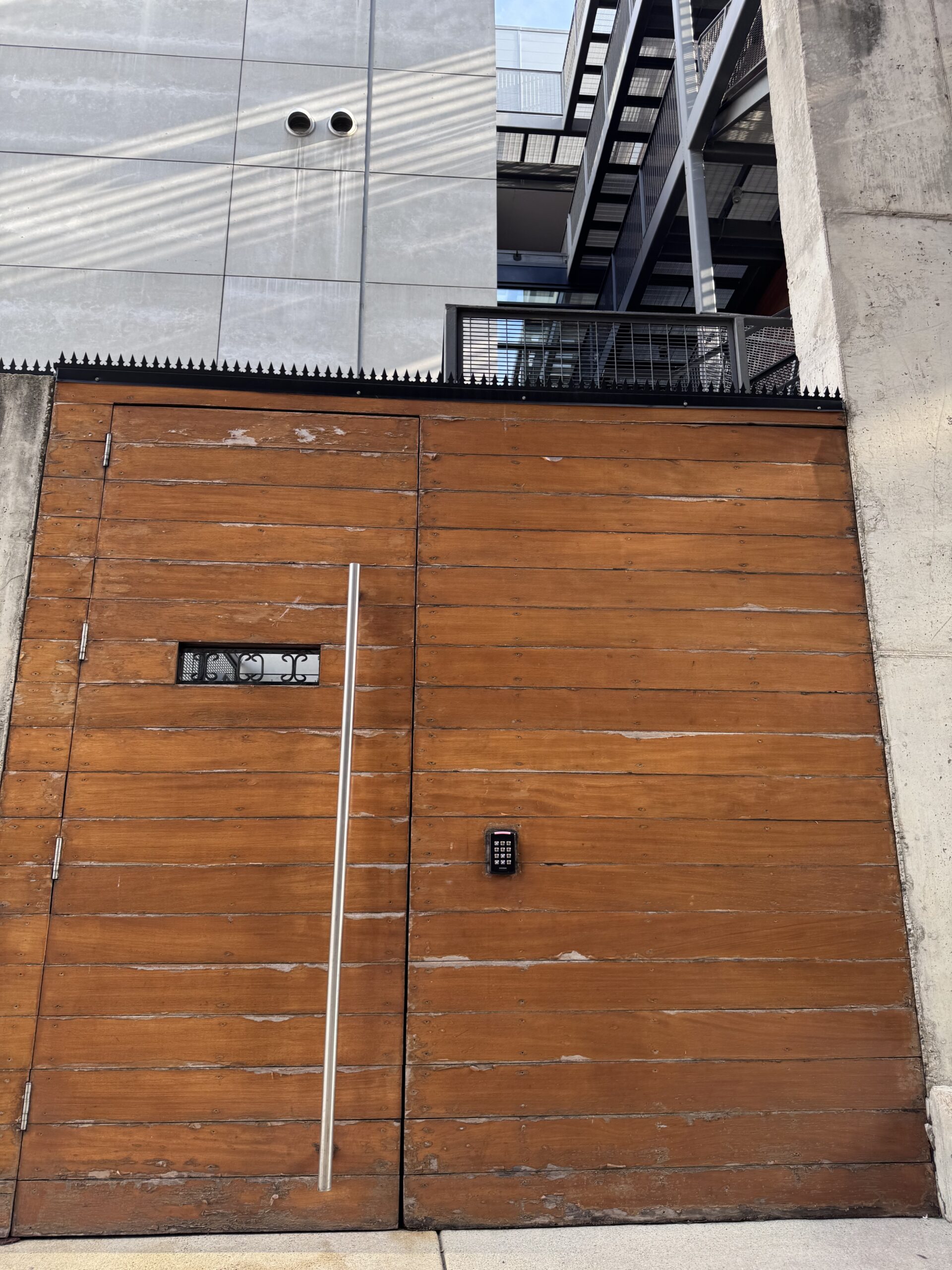 中心部から外れた静かなワシントンD.C.のモダンアパートのオーナーのK.K.様より外構の防犯についてご相談いただき、ご対応させていただきましたことをご紹介させていただきます。高さ3mの木製エントランスゲート、隣接するコンクリート部、そして階段を囲うスチール製スクリーンフェンス上部に、「Gothic Black Dual Blade」をご提案させていただきました。
