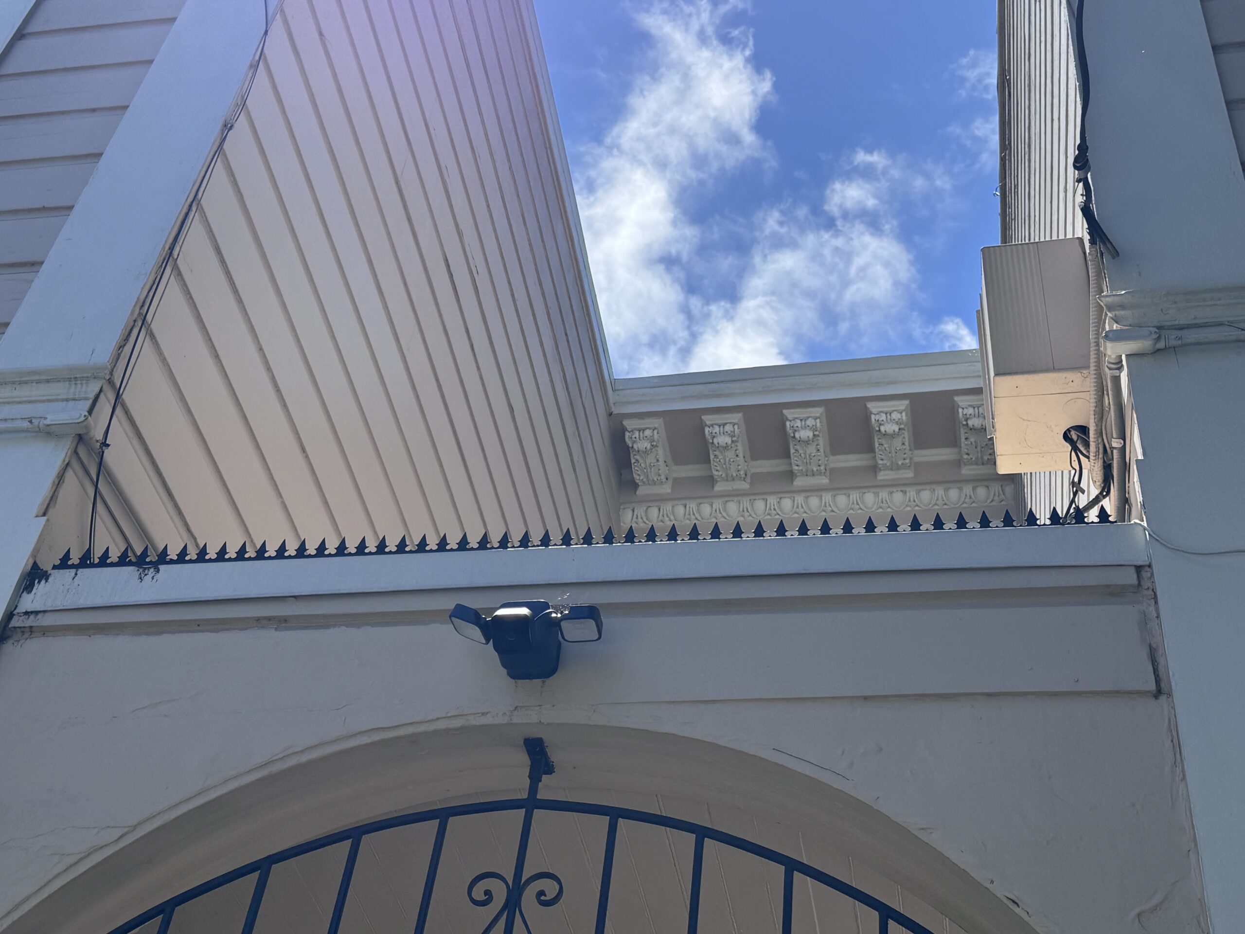 中心部から少し外れた静かなワシントンD.C.の小規模アパートで、背の高い木製エントリーゲート、隣接するコンクリートの袖壁、そして階段塔を囲うスチール製セキュリティスクリーンに GIZAGIZA HEART ブラックを連続して設置した。通りからは細い影のラインに見え、近づけば 手掛かり・足掛かり・引っ掛け点を徹底的に排除する。(プライバシー保護のため住所は非公開)