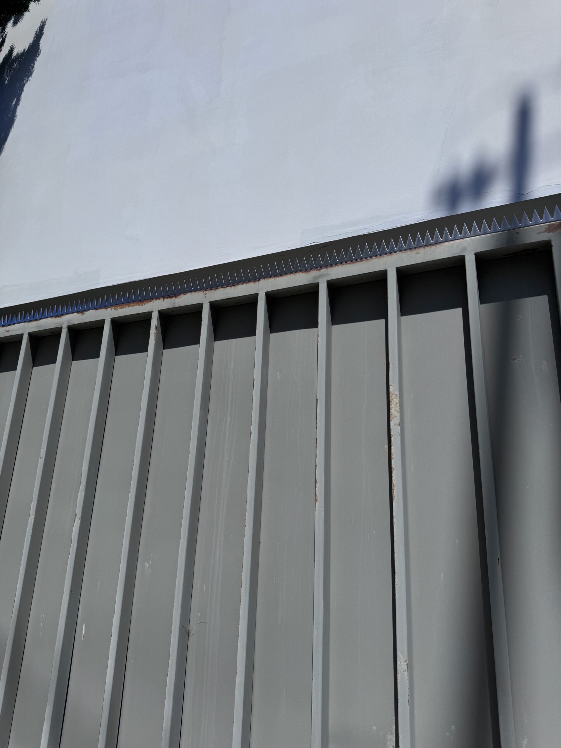 펜스 상단 클로즈업: 연속 스파이크 스트립과 흰 처마가 만드는 그림자.