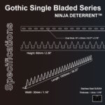 Ninja Deterrent Gothic Single Bladed Series specifications diagram showing stainless steel security spikes, 1000mm length, 60mm height, 30mm width, SUS304 material and oval mounting slots.