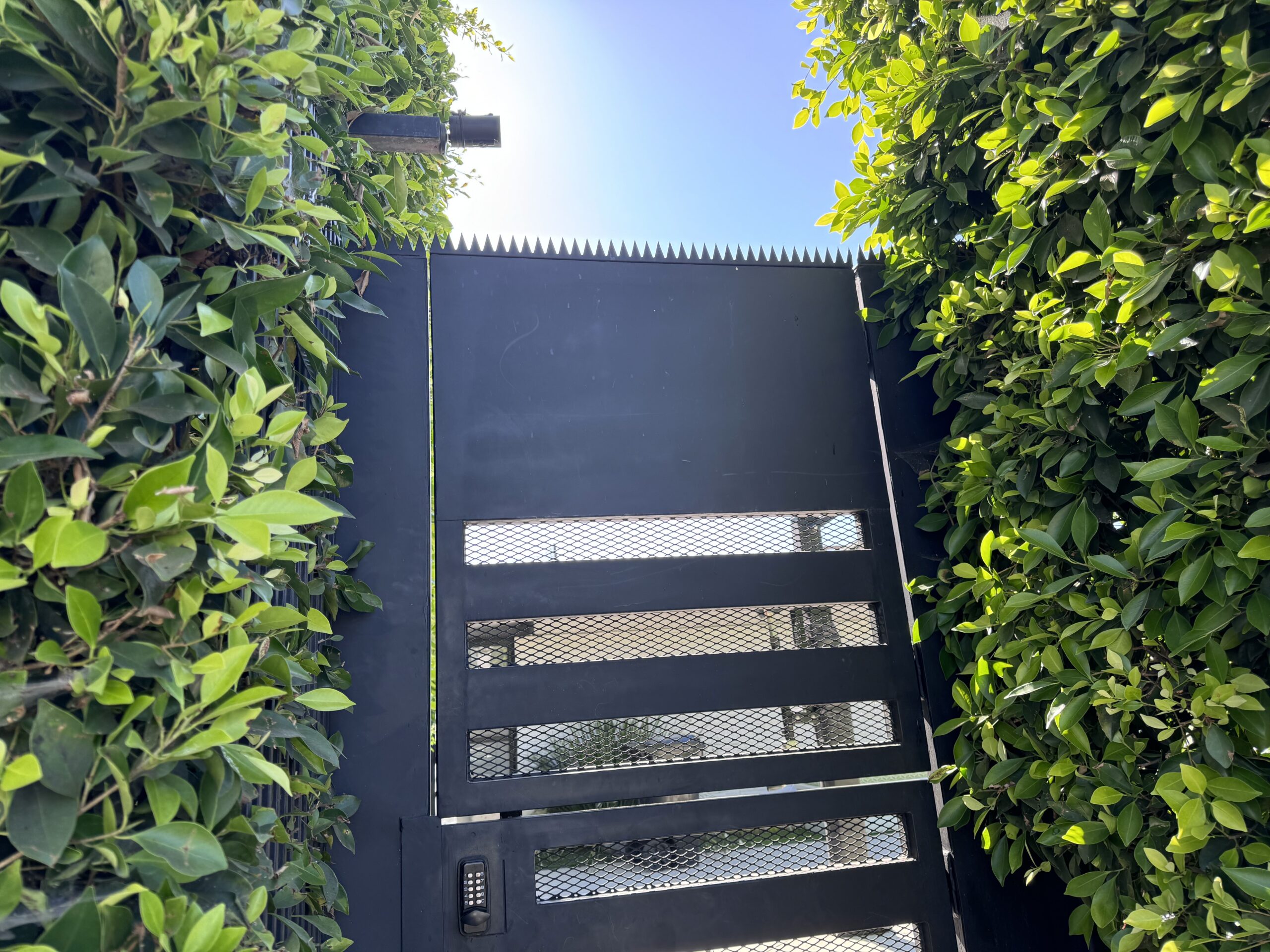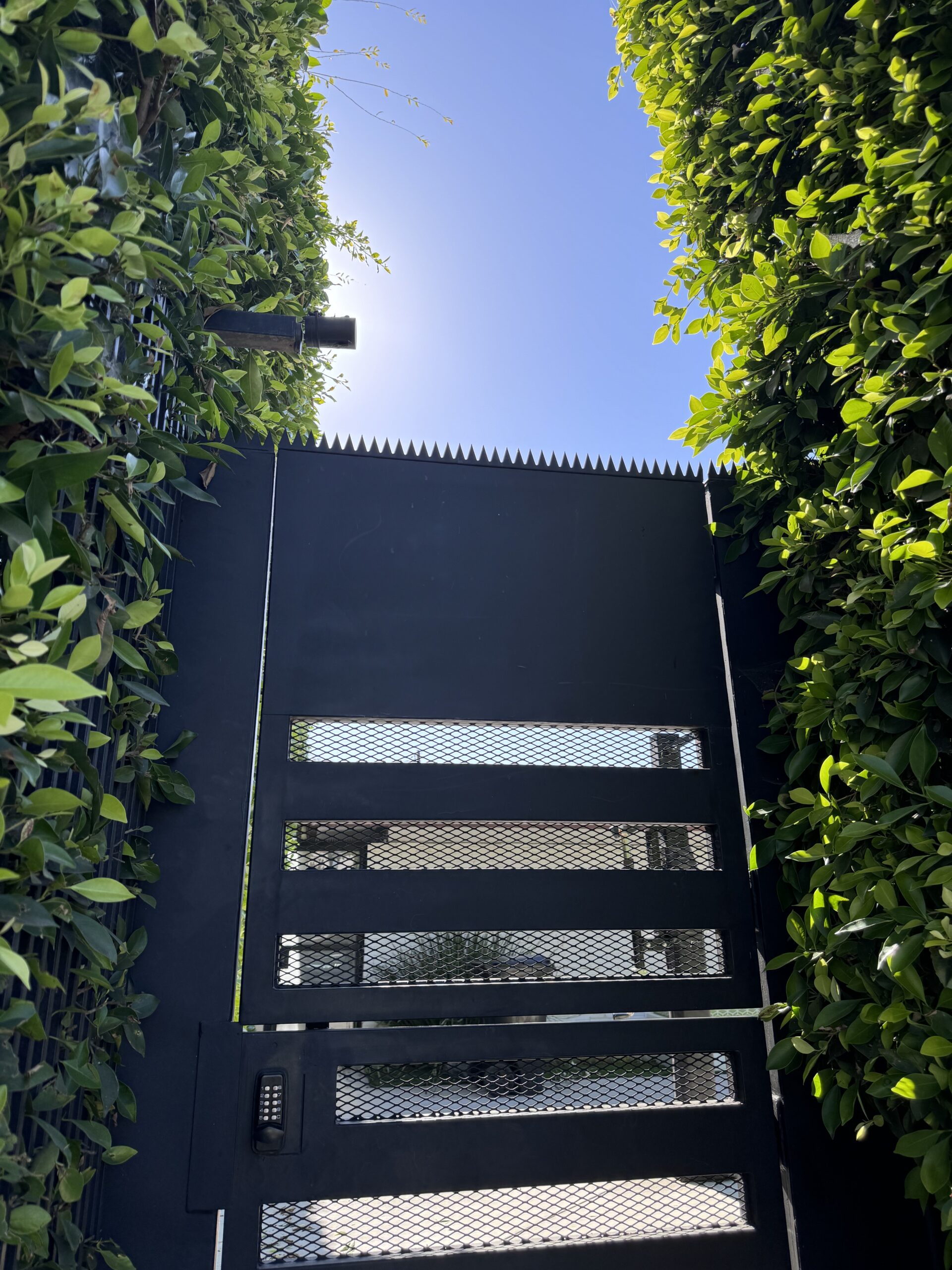 Uma segunda residência próxima, recuada da via principal na região da Highland Ave, solicitou uma solução coordenada para um portão lateral, em um ambiente mais tranquilo com estética que mistura o clássico e o moderno.