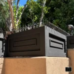 Espigões de segurança Ninja Deterrent decorativos em portão de garagem equipado com refletor (floodlight) para proteção noturna.