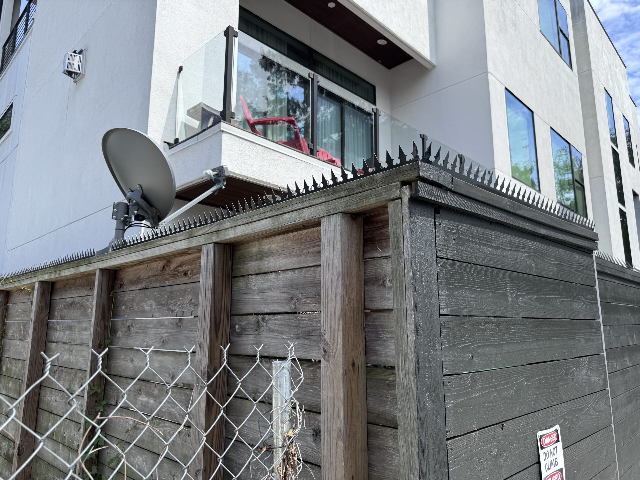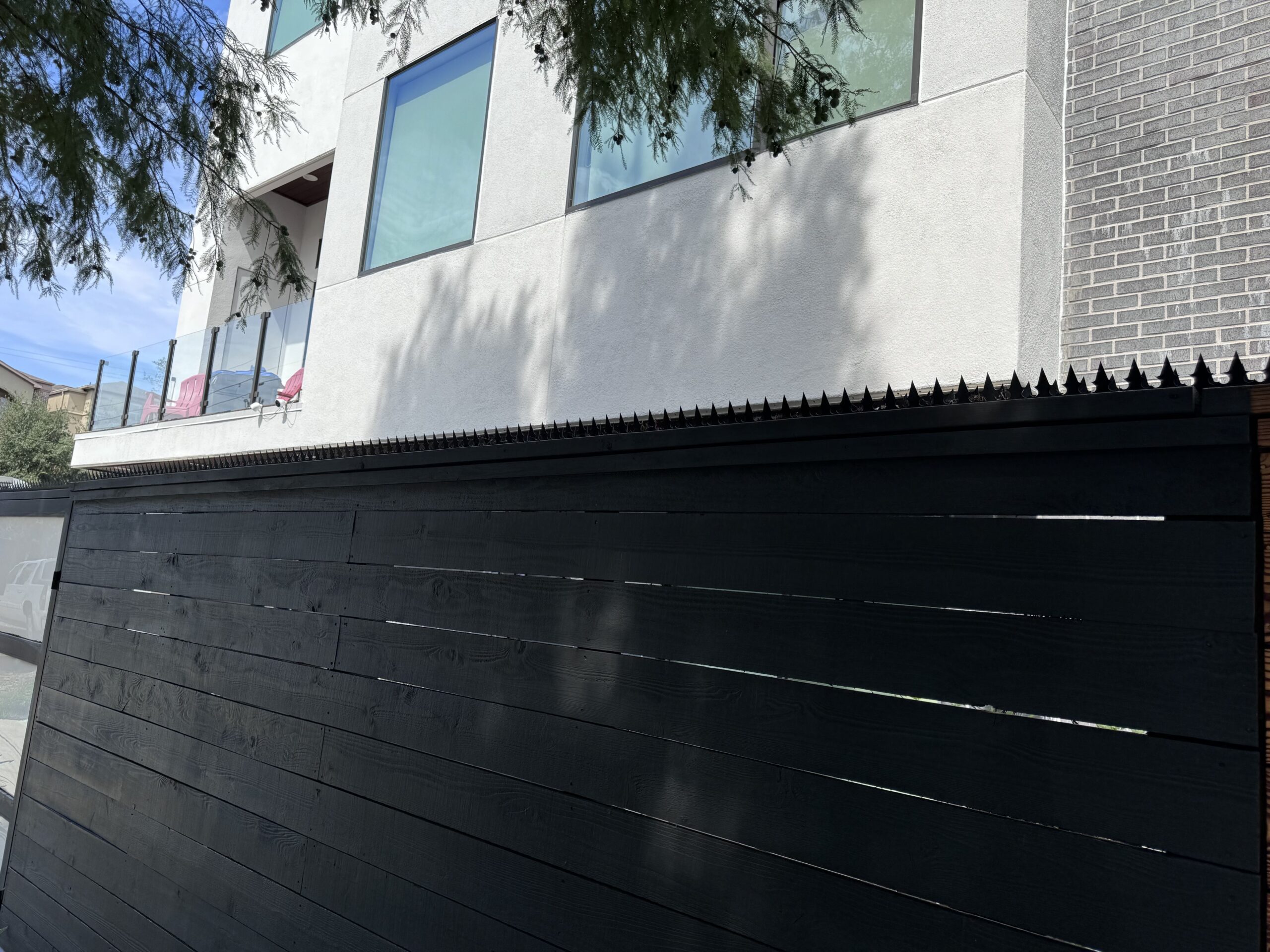 Em uma casa particular perto do centro de Houston, instalamos o Gothic (Black) de forma contínua ao longo do topo de uma cerca de madeira tingida em tom carvão. Os dentes nítidos complementam as linhas minimalistas da residência, ao mesmo tempo em que eliminam pontos de pega, apoios para o pé e pontos de gancho.