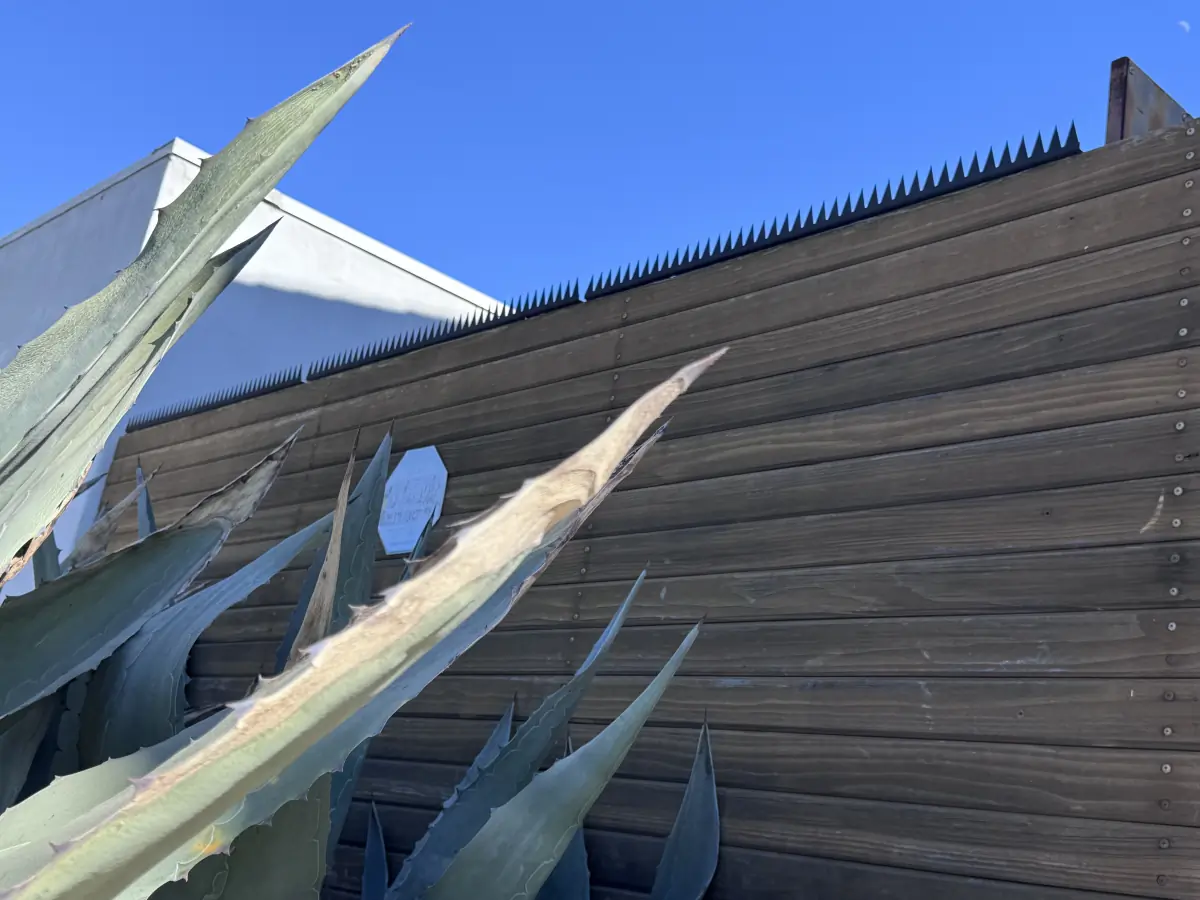 针对角地项目,我们在室外木墙顶部安装了 Ninja Deterrent™ Modern 锯齿形型材。这种如剃刀般利落的节奏感与横向护墙板及耐旱龙舌兰植栽完美融合,在呈现极简轮廓的同时,有效防止攀爬抓握,且避免了视觉上的杂乱。