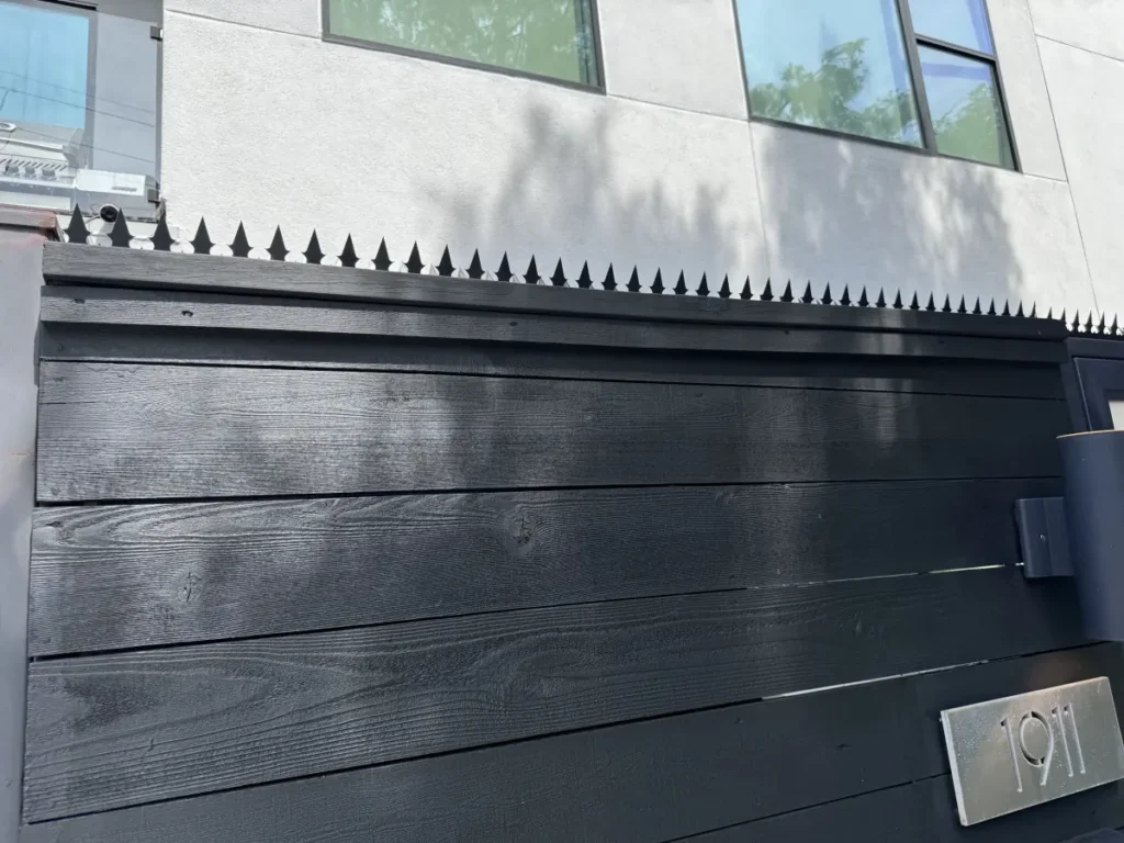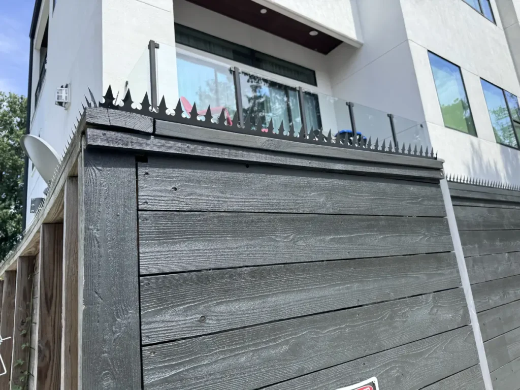 在休斯顿市中心附近的一处私人住宅,我们在一条炭色木栅栏的顶部安装了哥特式黑色双刃防攀爬尖刺。锋利的齿状设计与住宅的极简风格相辅相成,同时消除了抓握点、踩点和挂钩点。