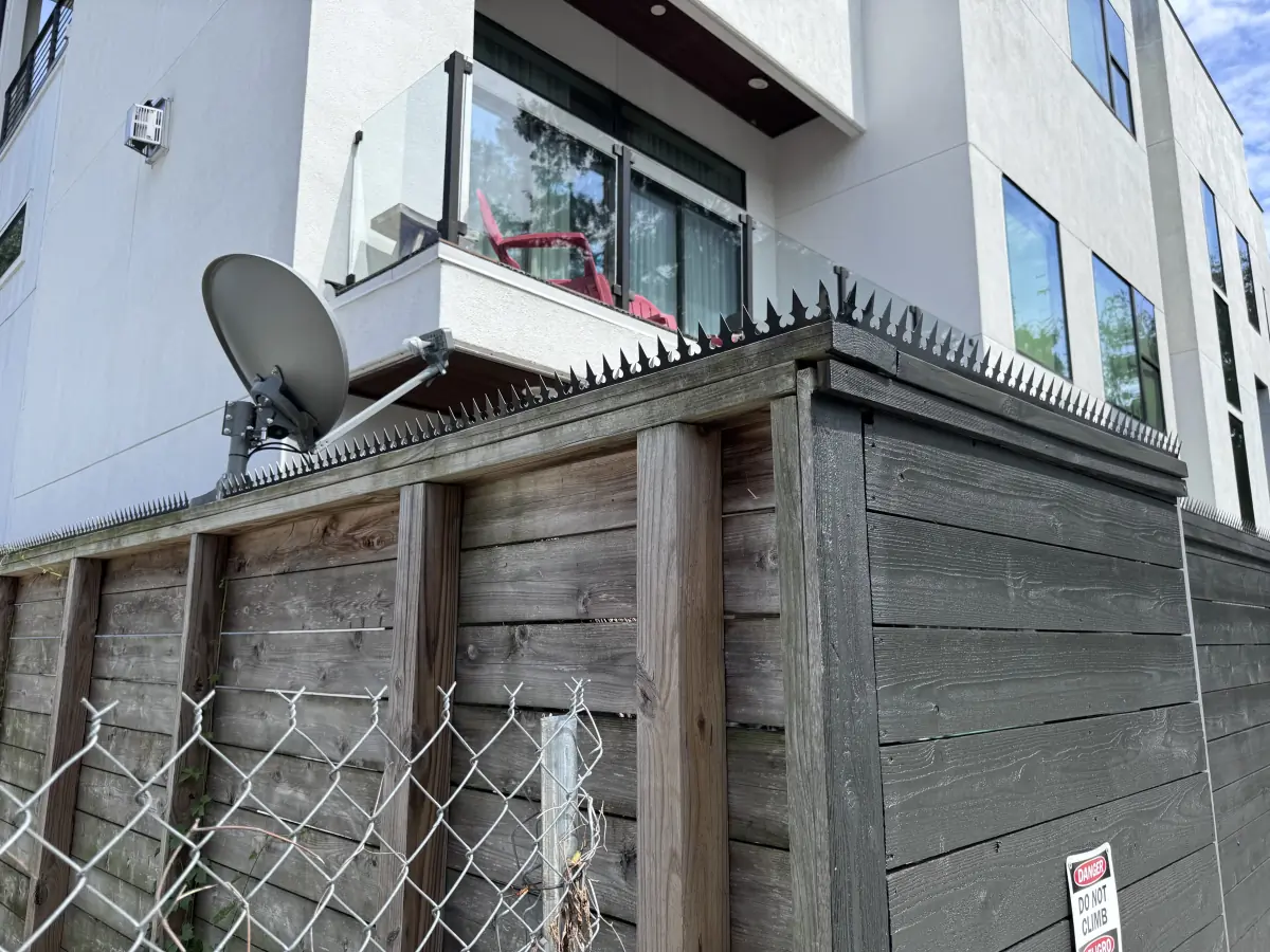 在休斯顿市中心附近的一处私人住宅,我们在一条炭色木栅栏的顶部安装了哥特式黑色双刃防攀爬尖刺。锋利的齿状设计与住宅的极简风格相辅相成,同时消除了抓握点、踩点和挂钩点。